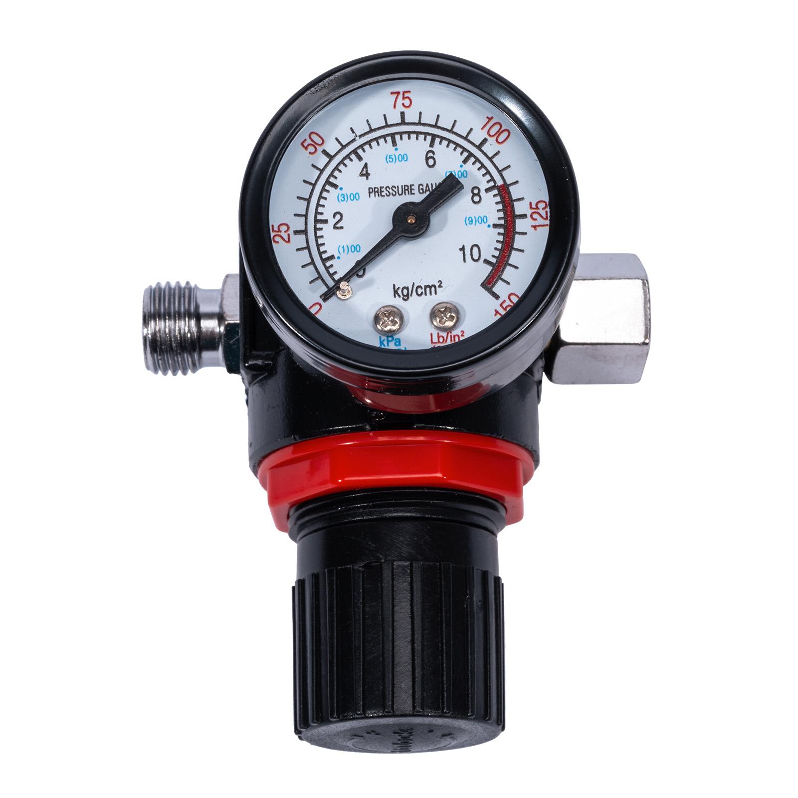 Regulator za natančno nastavitev tlaka stisnjenega zraka. Omogoča gladko regulacijo in enostaven nadzor trenutnega tlaka zaradi vgrajenega manometra. Idealen za uporabo s pnevmatskim orodjem, pištolami za barvanje in z drugimi napravami.